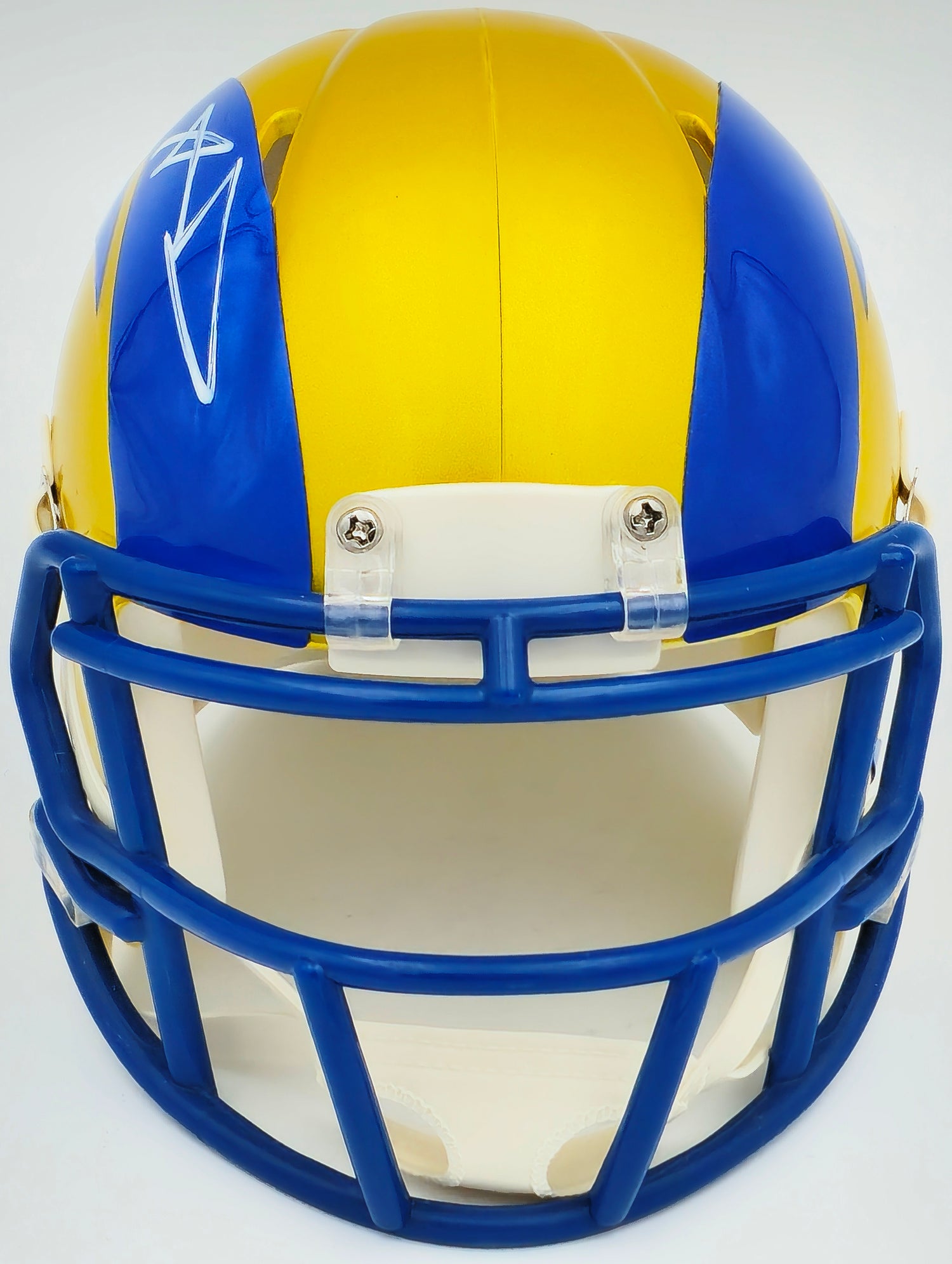 Own a piece of NFL history with this Los Angeles Rams Flash Yellow Speed Mini Helmet, personally hand-signed by Aaron Donald, one of the most dominant defensive players in football. This striking Flash alternate helmet features a sleek yellow design, making it a standout addition to any collection.