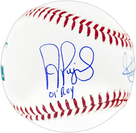 The "01 ROY" inscription adds significant value by documenting both players' Rookie of the Year awards, creating historical context that enhances collectible appeal. Inscribed dual-signed items are typically produced in smaller quantities than standard autographs, creating scarcity that drives collector demand among serious baseball memorabilia enthusiasts.