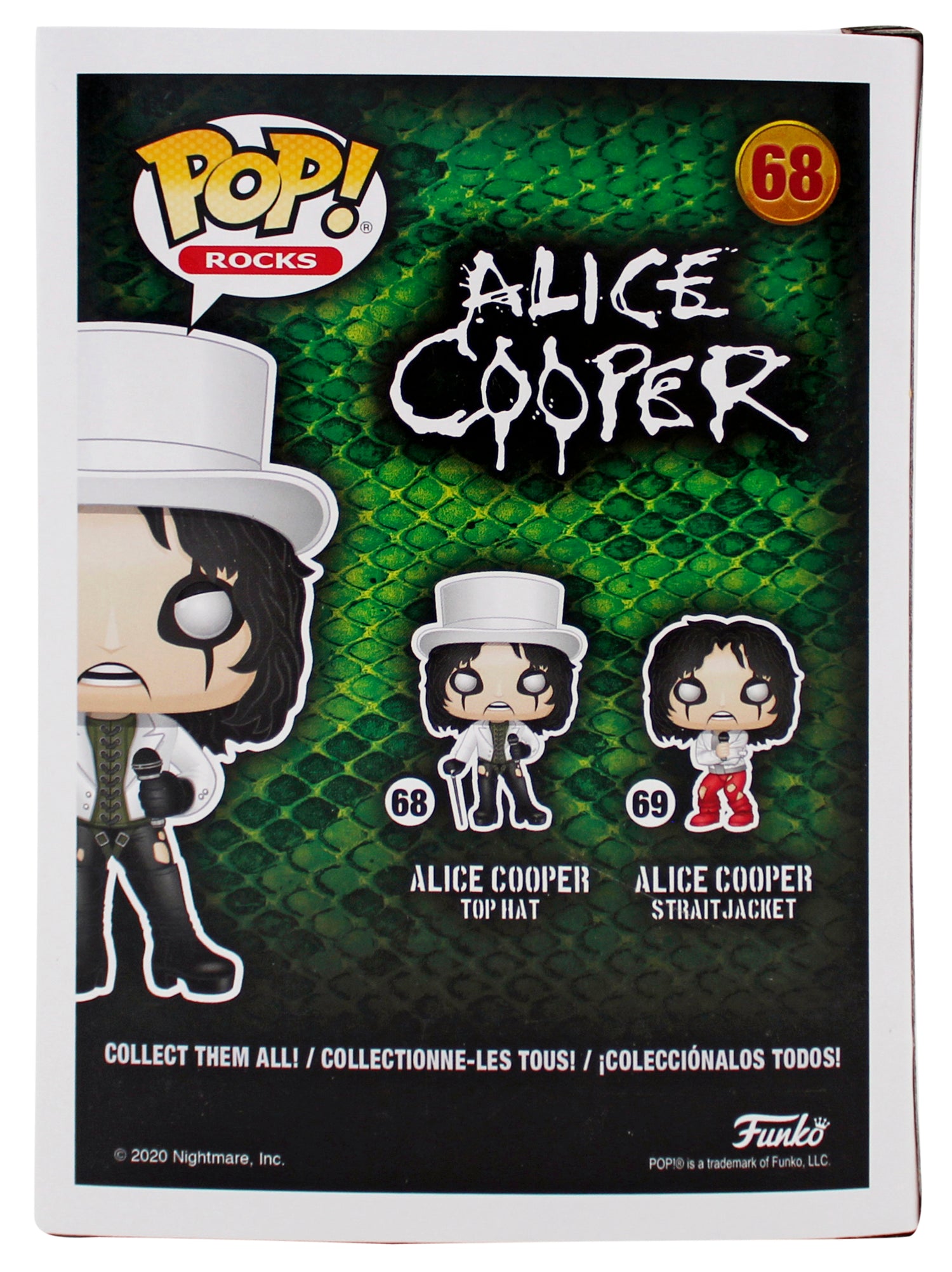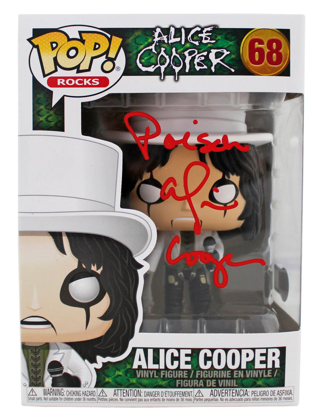 Own a legendary piece of rock history with this Alice Cooper signed Funko Pop Vinyl Figure (#68), featuring the rock icon's authentic hand-signed autograph in bold red ink, along with the inscription of his smash-hit song title, "Poison." This exclusive collectible is a must-have for Alice Cooper fans and rock memorabilia collectors, offering a rare opportunity to own a Funko Pop personally signed by the shock rock legend himself.