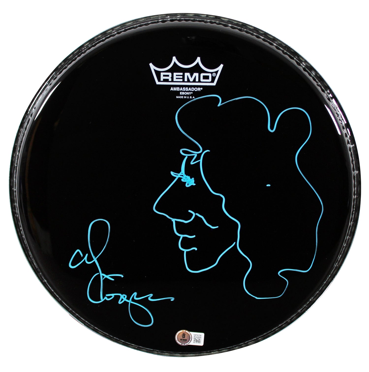 This 13-inch drum head has been hand-signed by legendary rock star Alice Cooper, featuring a striking blue signature along with a rare self-portrait sketch. A true one-of-a-kind collectible, this drum head captures the edgy spirit of a rock icon, making it a must-have for any Alice Cooper fan or music memorabilia collector.