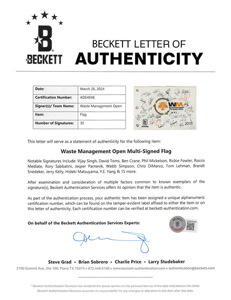 (30) Singh, Mickelson, Fowler, Matsuyama Signed 2011 WM Open Flag BAS #AD64048