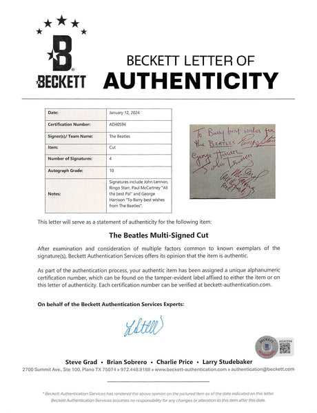 (4) Lennon, McCartney, Harrison & Starr Signed 3.85x4.5 Cut Sig Auto 10 BAS Slab