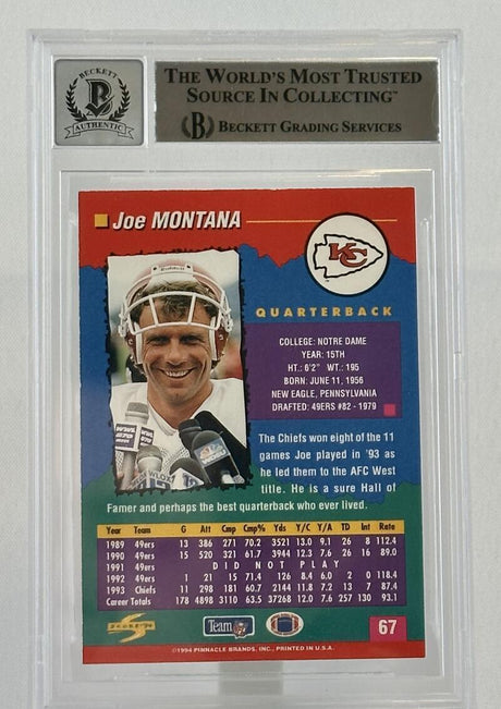 1994 Pinnacle #102 Joe Montana Auto Kansas City Chiefs BGS Autograph 10