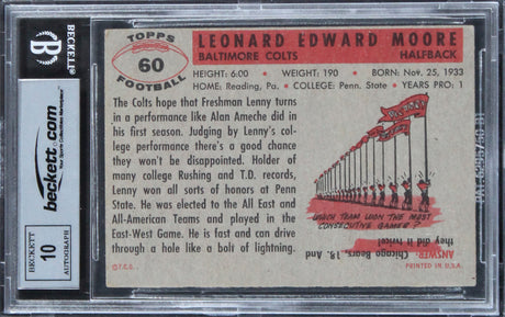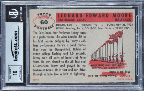 Colts Lenny Moore "HOF 75" Signed 1956 Topps #60 Rookie Card Auto 10 BAS Slab 2