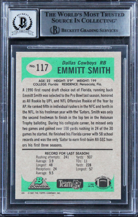Cowboys Emmitt Smith Authentic Signed 1991 Bowman #117 Card Auto 10! BAS Slabbed