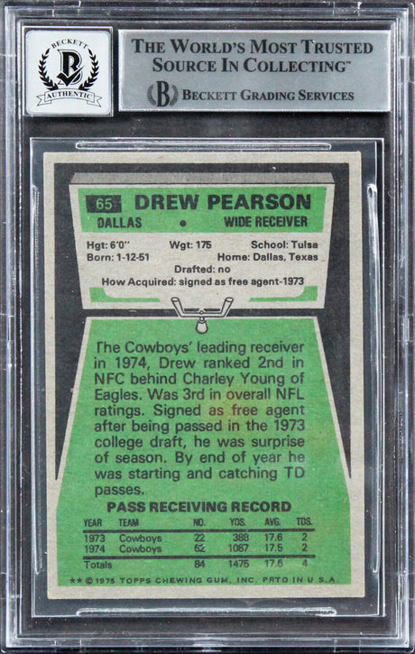 Cowboys Drew Pearson "HOF 21" Signed 1975 Topps #65 Card Auto 10! BAS Slabbed