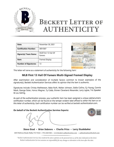 - Ships Free1st MLB HOF Class (13) Ruth, Gehrig, Johnson, Cobb +9 Signed Framed Display BAS Very low stock (1 unit)$142,799Unit price /Unavailable