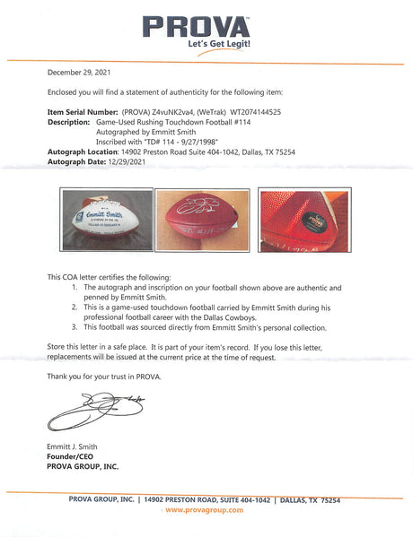 Cowboys Emmitt Smith "TD #114 - 09/27/1998" Signed GU Football BAS & Prova LOA