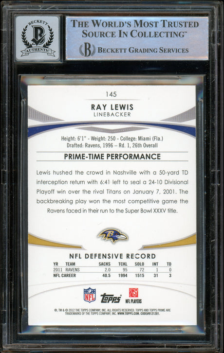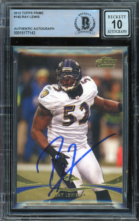 - Ships Free2012 Topps Prime #145 Ray Lewis Baltimore Ravens BGS Autograph 10 Very low stock (1 unit)$149Unit price /Unavailable