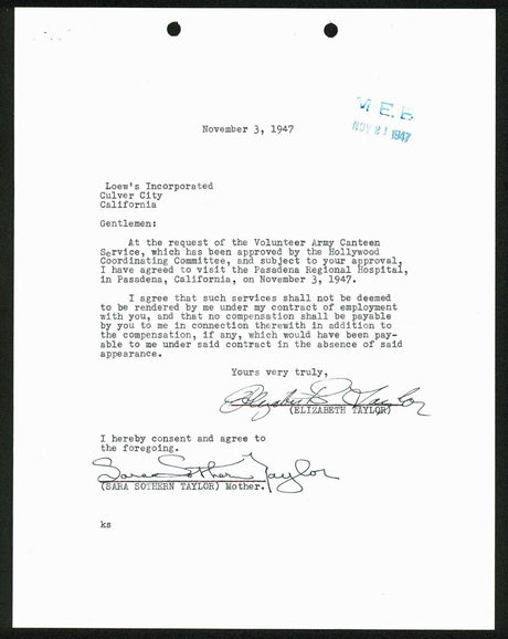 Elizabeth Taylor Signed 8.5x11 Letter Dated November 3rd 1947 PSA/DNA #X03948