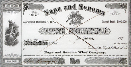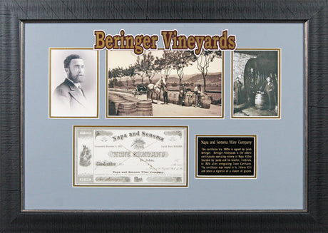 Jacob Beringer Signed & Framed 4.5x9 Napa and Sonoma Wine Stock Certificate BAS