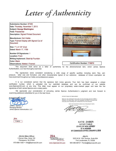 George Washington Signed 1x4.5 Cut Signature Framed Display JSA #Y18072