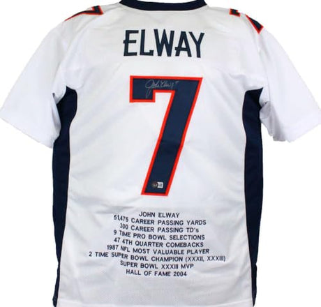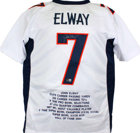 John Elway Autographed White Pro Style STAT Jersey- Beckett W Hologram *Silver