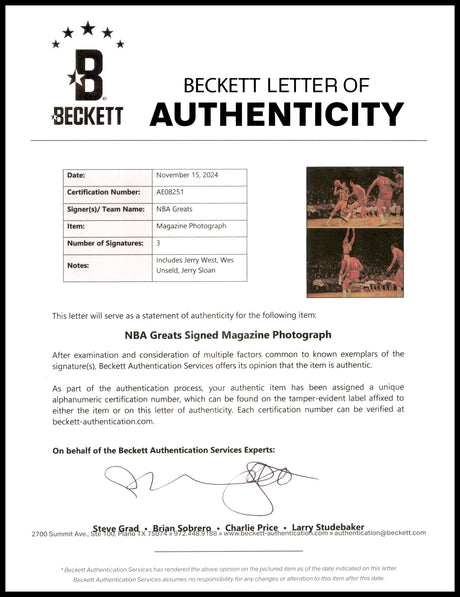 $379Unit price /UnavailableJerry West, Jerry Sloan & Wes Unseld Autographed 8x11 Magazine Page Photo Beckett BAS #AE08251