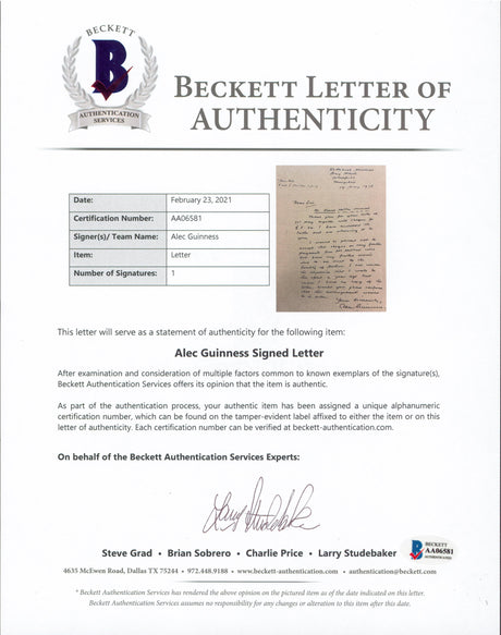 Alec Guinness Star Wars Authentic Signed 1978 Handwritten Letter BAS #AA06581