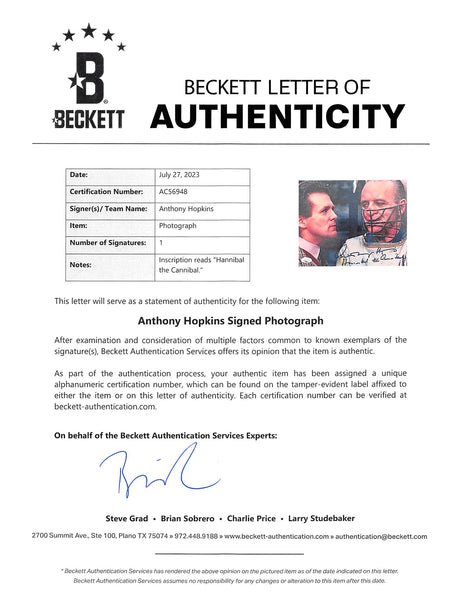 Very low stock (1 unit)$2,379Unit price /Unavailable Anthony Hopkins Autographed 11x14 Photo Silence of the Lambs Beckett BAS #AC95469