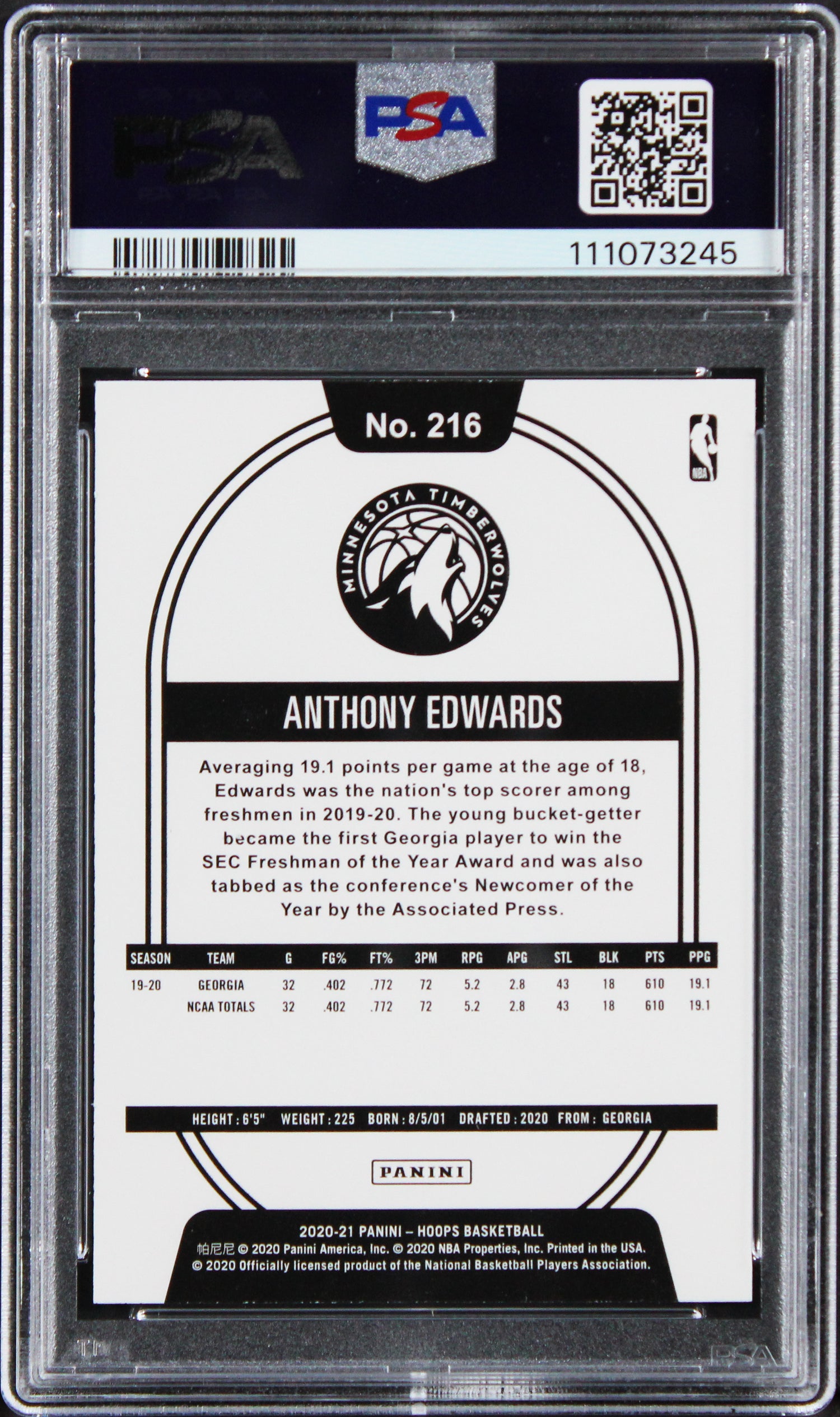 Anthony Edwards Signed 2020 Panini Hoops #216 RC Card 9! Auto 10! PSA/DNA Slab