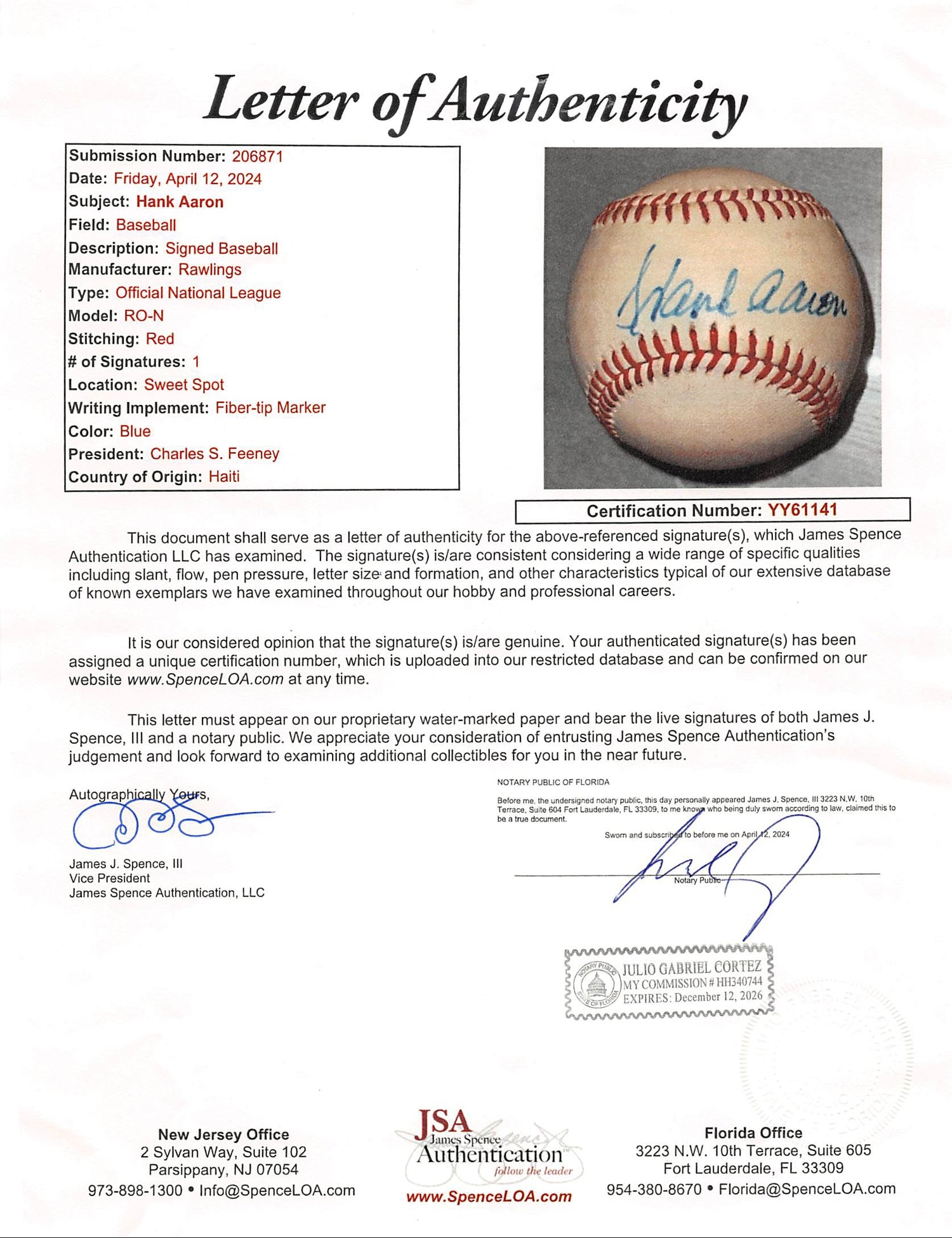 Braves Hank Aaron Authentic Signed Charles Feeney Onl Baseball JSA #YY61141