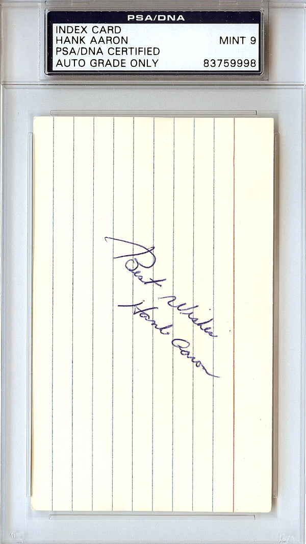 Hank Aaron Autographed 3x5 Index Card Atlanta Braves "Best Wishes" Mint 9 Vintage 1950's Signature PSA/DNA #83759998