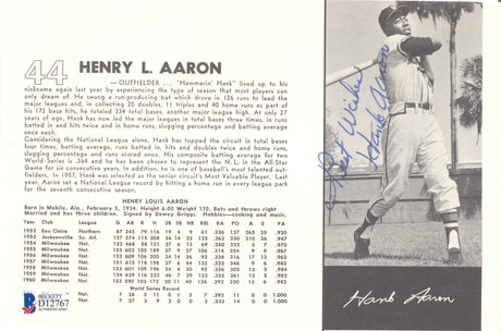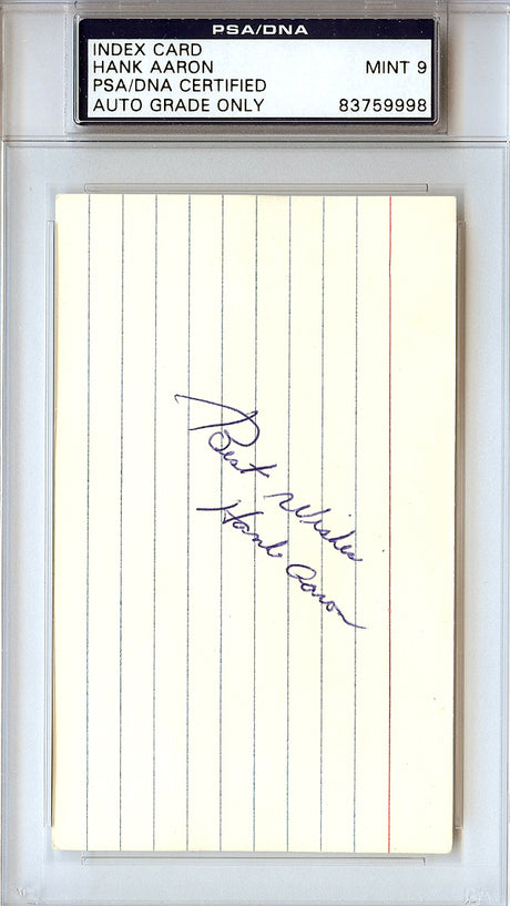 Very low stock (1 unit)$399Unit price /UnavailableHank Aaron Autographed Index Card Atlanta Braves Vintage Playing Days PSA/DNA #65060704