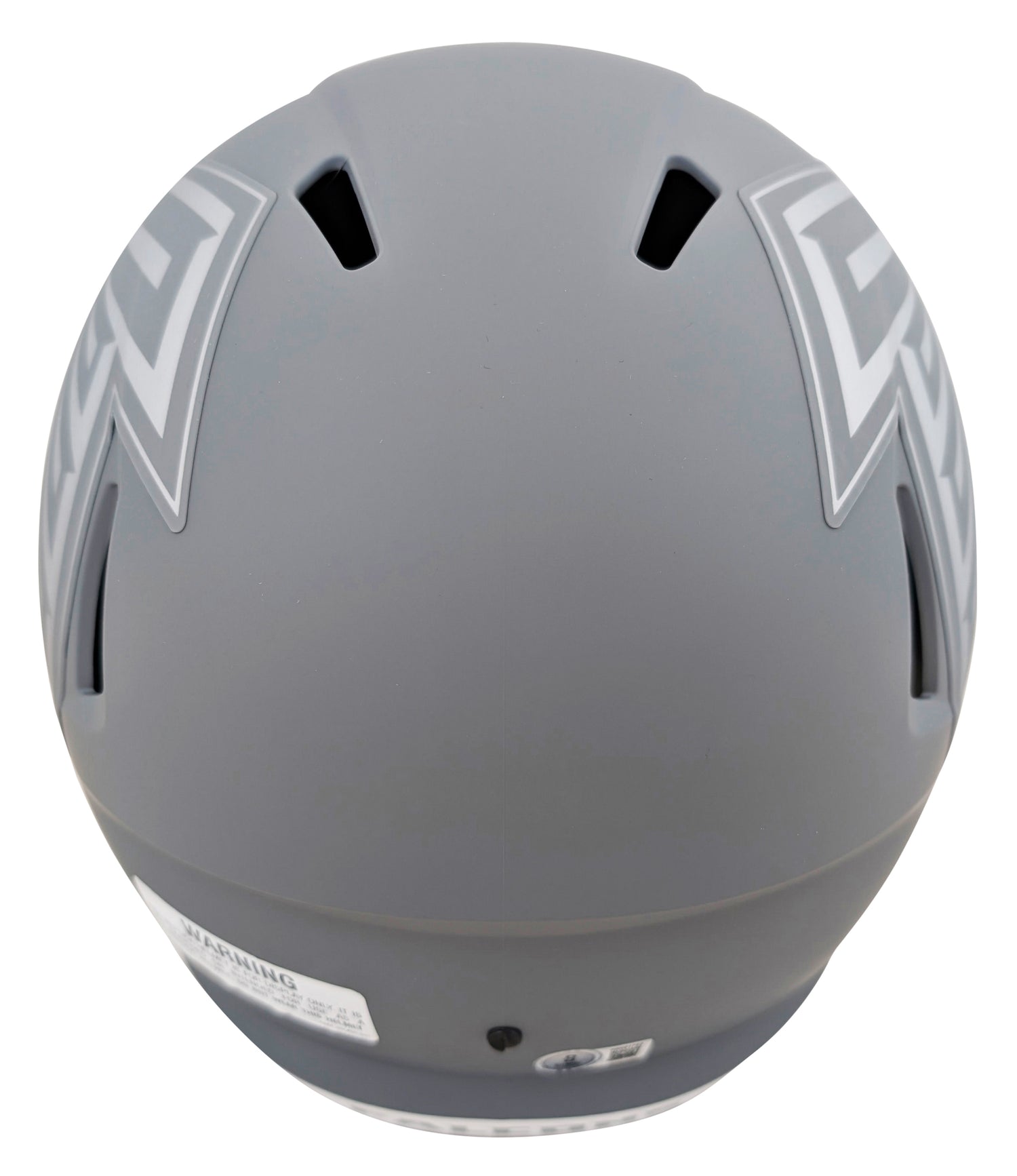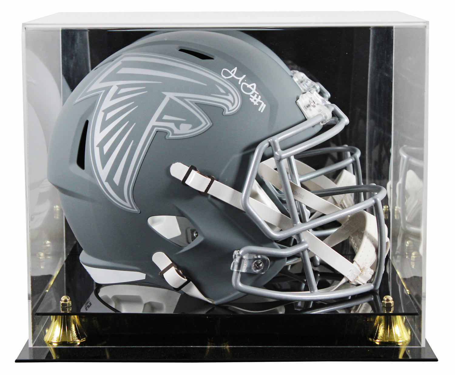 Own a piece of Atlanta Falcons history with this Julio Jones Autographed Alternate Slate Riddell Full Size Speed Replica Helmet, mounted in a striking UV Mirrored Back Acrylic Display Case. One of the most dynamic wide receivers in NFL history, Julio Jones helped define a generation of Atlanta Falcons football, and this collectible pays tribute to his legendary career. Each helmet has been personally hand-signed by Julio Jones and authenticated by the trusted experts at Beckett Authentication Services (BAS). Part of the exclusive BAS Witnessed Protection Program, this item was signed in the presence of a Beckett representative, guaranteeing 100% authenticity. Whether you're curating a premium memorabilia collection or searching for the ultimate gift for a Falcons fan, this signed helmet is a showpiece that commands attention.