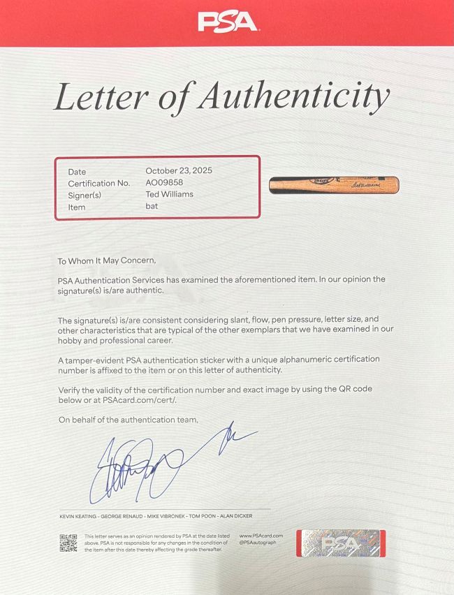 - Hand-signed by legendary hitter Ted Williams, Hall of Fame inductee and Boston Red Sox icon