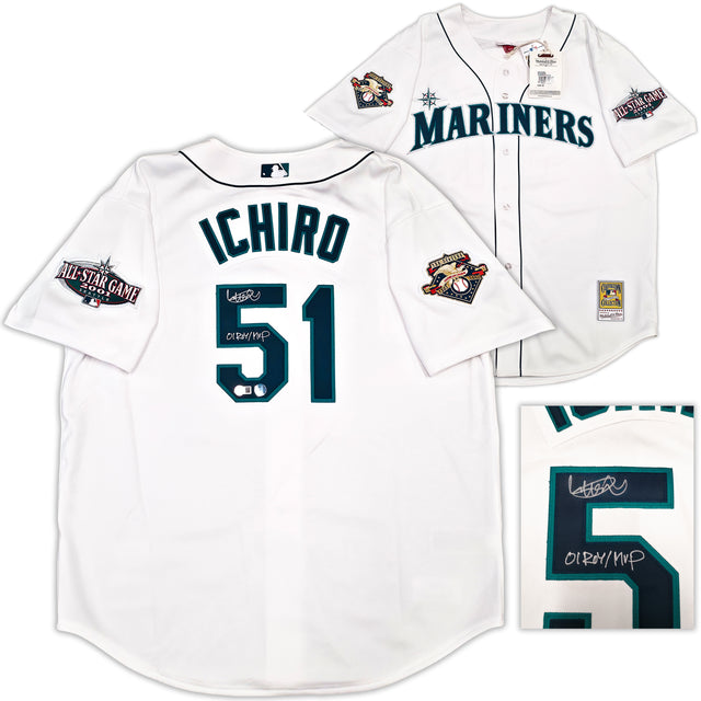 Seattle Mariners Ichiro Suzuki Autographed White Authentic Mitchell & Ness Cooperstown Authentic Collection 2001 ASG Patch Rookie Jersey Size 52 "01 ROY/MVP" IS Holo & Beckett BAS Witness Stock #256851