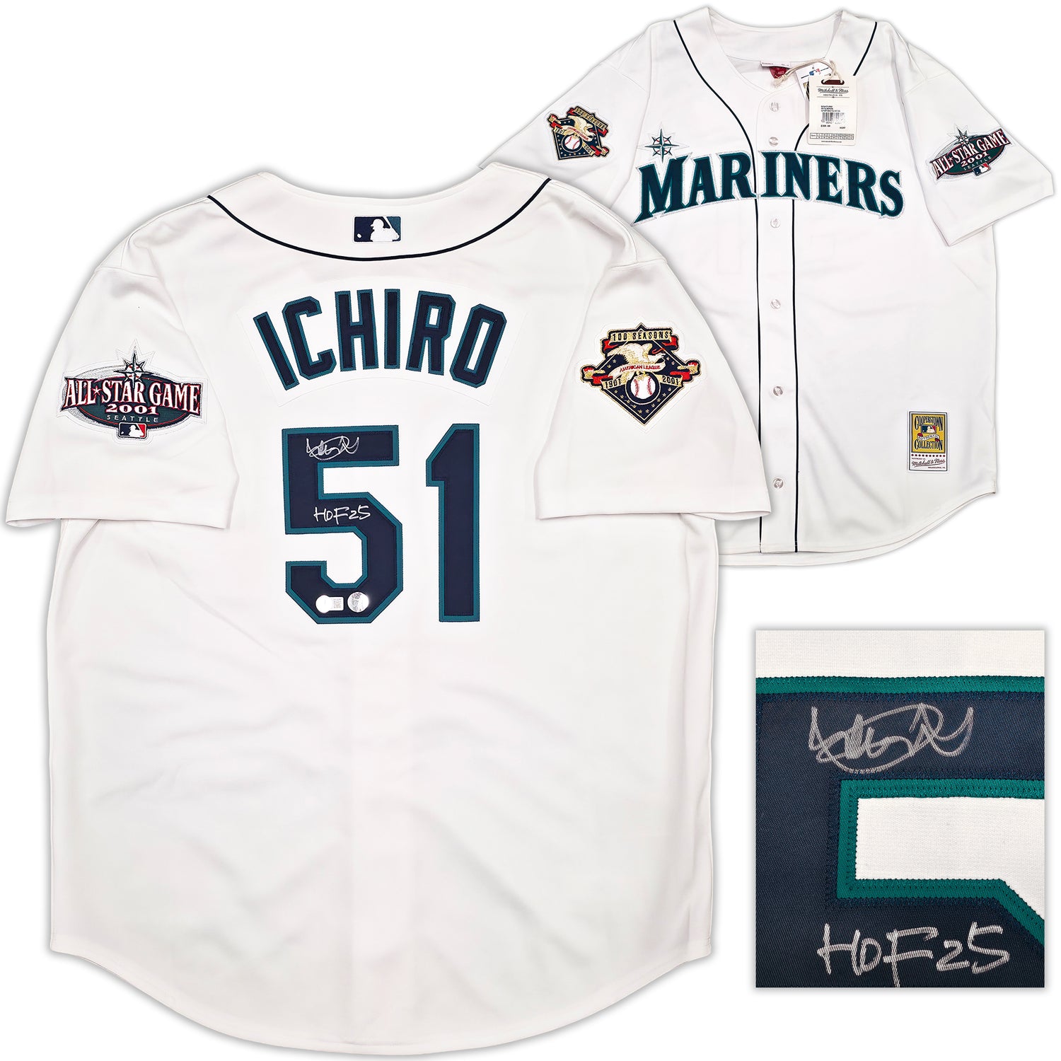 Own a piece of baseball history with this limited edition White Authentic Mitchell & Ness Seattle Mariners Cooperstown Authentic Collection 2001 All-Star Game Patch Rookie Jersey, personally signed by legendary outfielder Ichiro Suzuki. As a standout during his unforgettable 2001 rookie season, Ichiro electrified fans and made an immediate impact on the game, ultimately earning a well-deserved place in Cooperstown. This collectible jersey celebrates that iconic year and has been inscribed with "HOF 25", honoring his induction into the National Baseball Hall of Fame in 2025. A true treasure for Seattle Mariners fans and serious collectors alike, this jersey immortalizes one of baseball’s most influential global superstars.