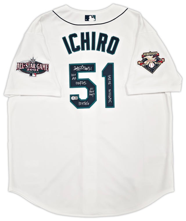 Seattle Mariners Ichiro Suzuki Autographed White Authentic Mitchell & Ness Cooperstown Authentic Collection 2001 ASG Patch Rookie Jersey Size 52 With 7 Stats IS Holo & Beckett BAS Witness Stock #256850