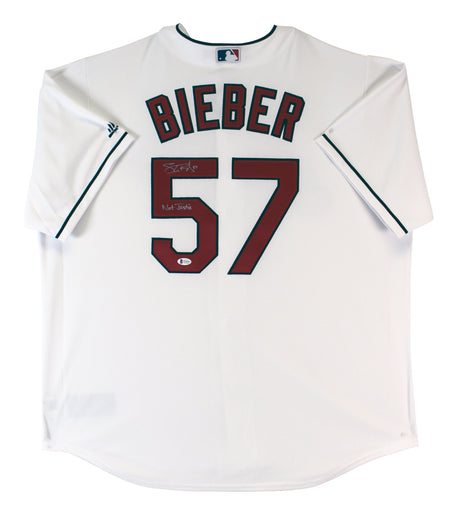 Indians Shane Bieber "Not Justin" Signed White Majestic Cool Base Jersey BAS Wit