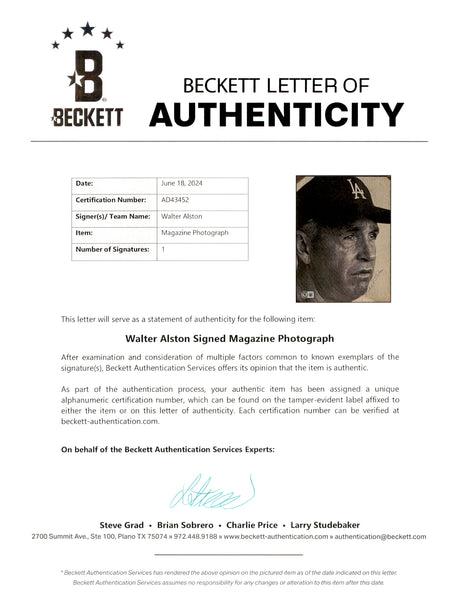 Walter Alston Autographed 8x10 Magazine Page Photo Los Angeles Dodgers Beckett BAS #AD43452