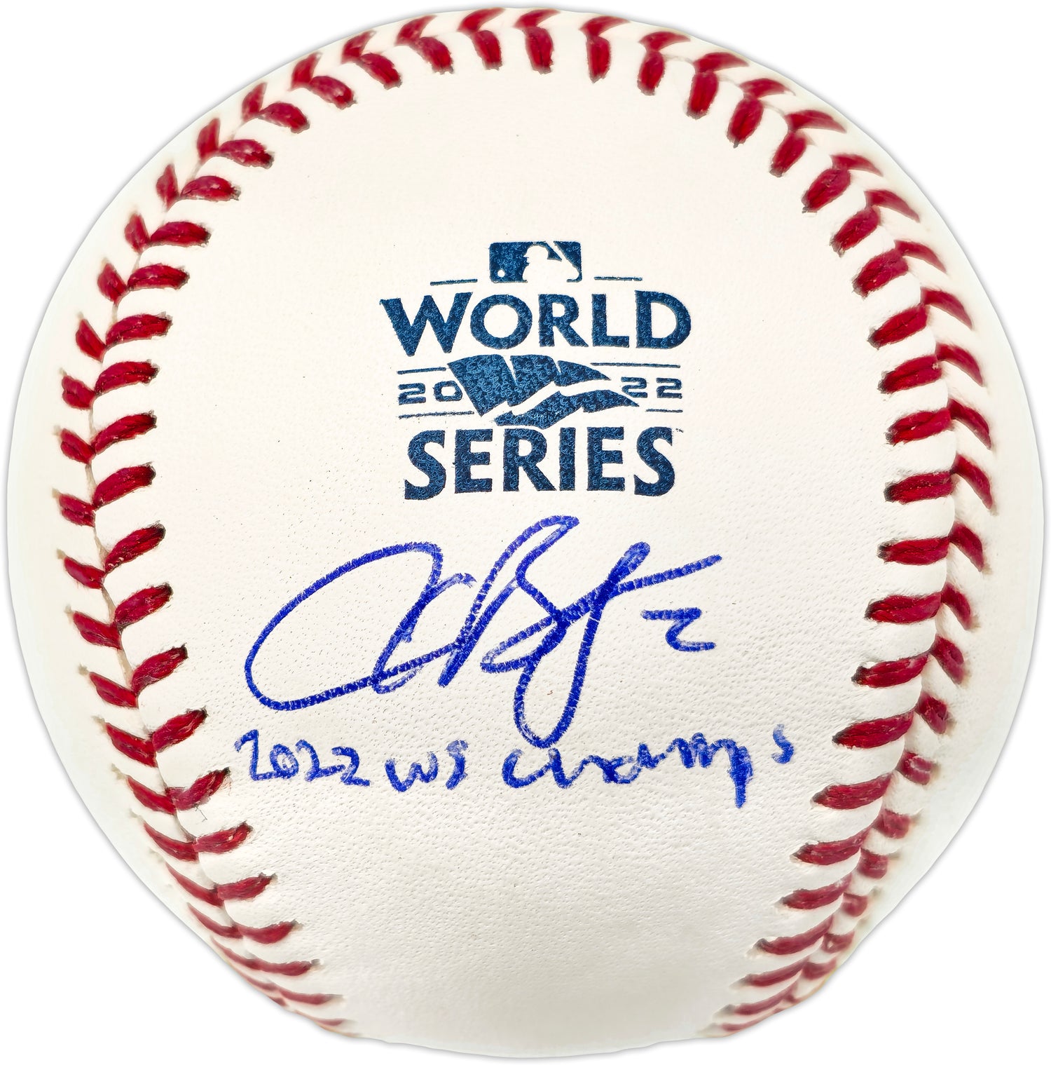 This Official 2022 World Series Logo Baseball has been hand-signed by Alex Bregman and inscribed with "2022 WS Champs." A key piece for baseball collectors, this ball commemorates the Houston Astros' championship victory, making it a must-have for fans of Bregman and the team's historic win.