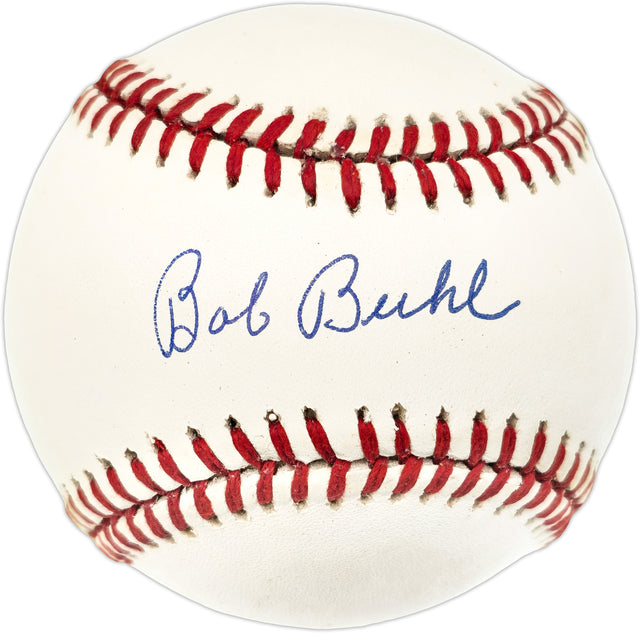 This is a highly collectible Official National League Baseball hand-signed by legendary pitcher Bob Buhl. A key figure in Major League Baseball during the 1950s and 1960s, Buhl was known for his strong pitching performances with the Milwaukee Braves, Chicago Cubs, and Philadelphia Phillies.