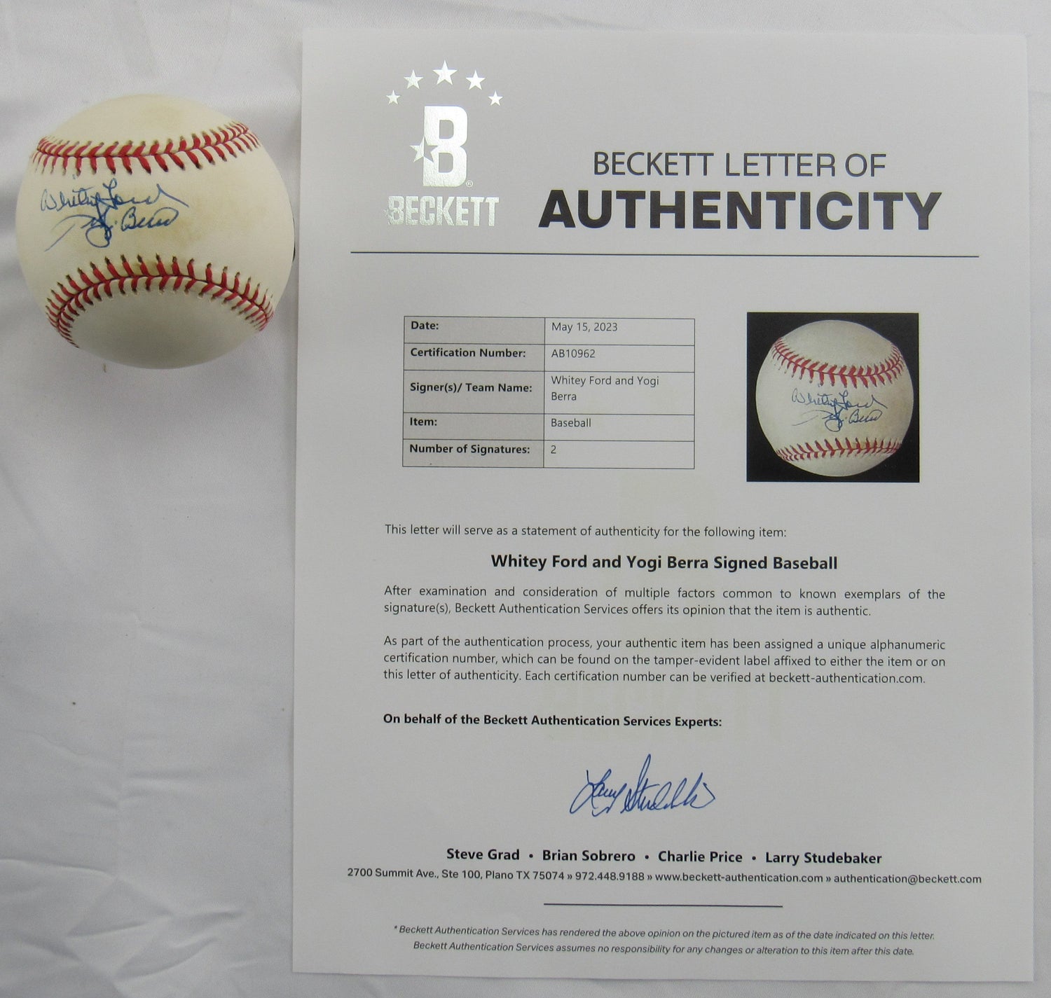 Own a rare piece of New York Yankees history with this Whitey Ford & Yogi Berra dual-signed Rawlings baseball, authenticated with a Beckett Letter of Authenticity (LOA). Celebrating two of the most iconic legends in Yankees and baseball history, this signed baseball is a must-have centerpiece for any serious memorabilia collection or fan cave. Both Whitey Ford, the Hall of Fame lefty known as "The Chairman of the Board," and Yogi Berra, the legendary catcher and 10-time World Series champion, played vital roles in the Yankees’ golden era of dominance during the 1950s and 1960s—a time that defined a dynasty and shaped the future of America's pastime.