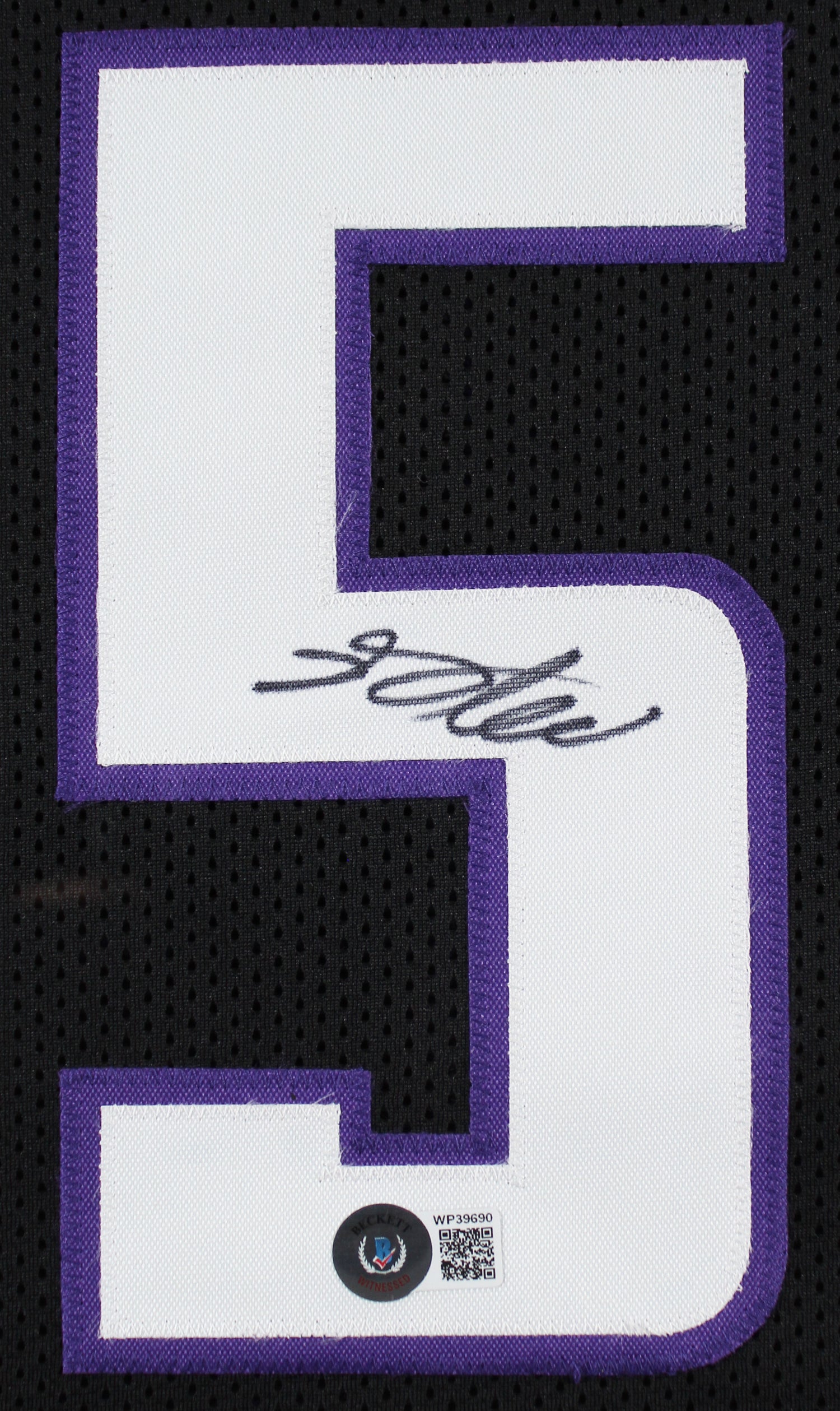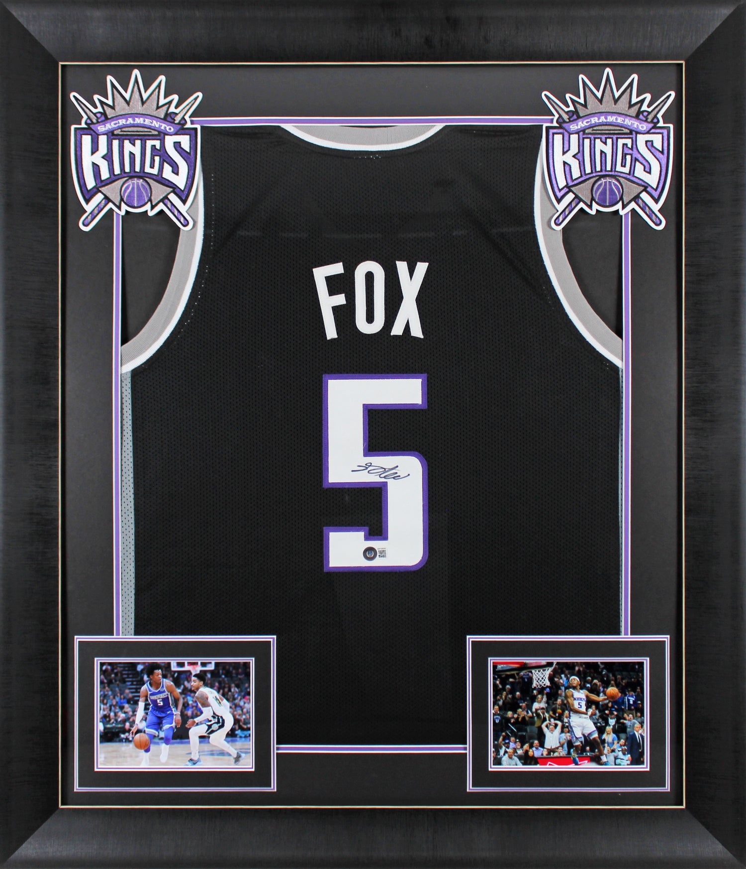 This Autographed Black Pro Style Jersey has been personally signed by De'Aaron Fox, the star point guard of the Sacramento Kings. A must-have for basketball enthusiasts and serious collectors, this signed jersey is a tribute to one of the NBA’s most dynamic players. Each jersey is 100% Authentic, verified by Beckett Authentication Services (BAS) and includes their official hologram with a scannable QR code for easy verification. This item is part of Beckett’s Witnessed Protection Program, meaning a BAS representative was present at the time of signing, ensuring authenticity. ### Key Features: