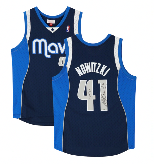 Dirk Nowitzki Autographed/Inscribed "HOF' 23" Dallas Mavericks Navy Blue Mitchell & Ness 2010-11 Swingman Jersey Fanatics is backordered and will ship as soon as it is back in stock.