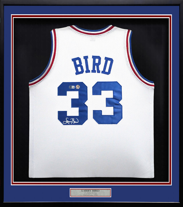 Celebrate the legacy of one of basketball’s most iconic legends with this framed White All Star Jersey hand signed by Larry Bird—a stunning addition to any sports memorabilia collection. Measuring approximately 31x36 inches with the frame, this custom XL jersey features high-quality sewn-in name and numbers, professionally displayed for visual impact and long-term preservation. While not affiliated with a name brand, this jersey carries immense value through its connection to the basketball legend who helped define the golden era of the Boston Celtics and the NBA in the 1980s.