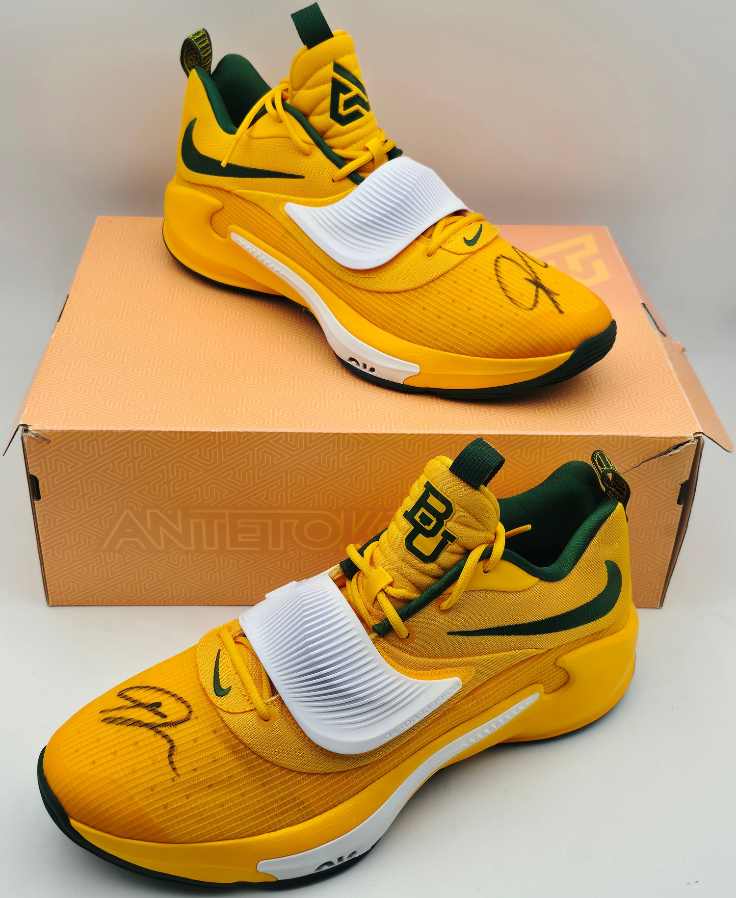 Giannis Antetokounmpo Autographed 2021 Player Exclusive (PE) Promo BAYLOR UNIVERSITY University Gold & Gorge Nike Zoom Freak 3 NCAA SOS Shoes Size 17 (With Box) Beckett BAS Witness #3W396622 & #3W396623