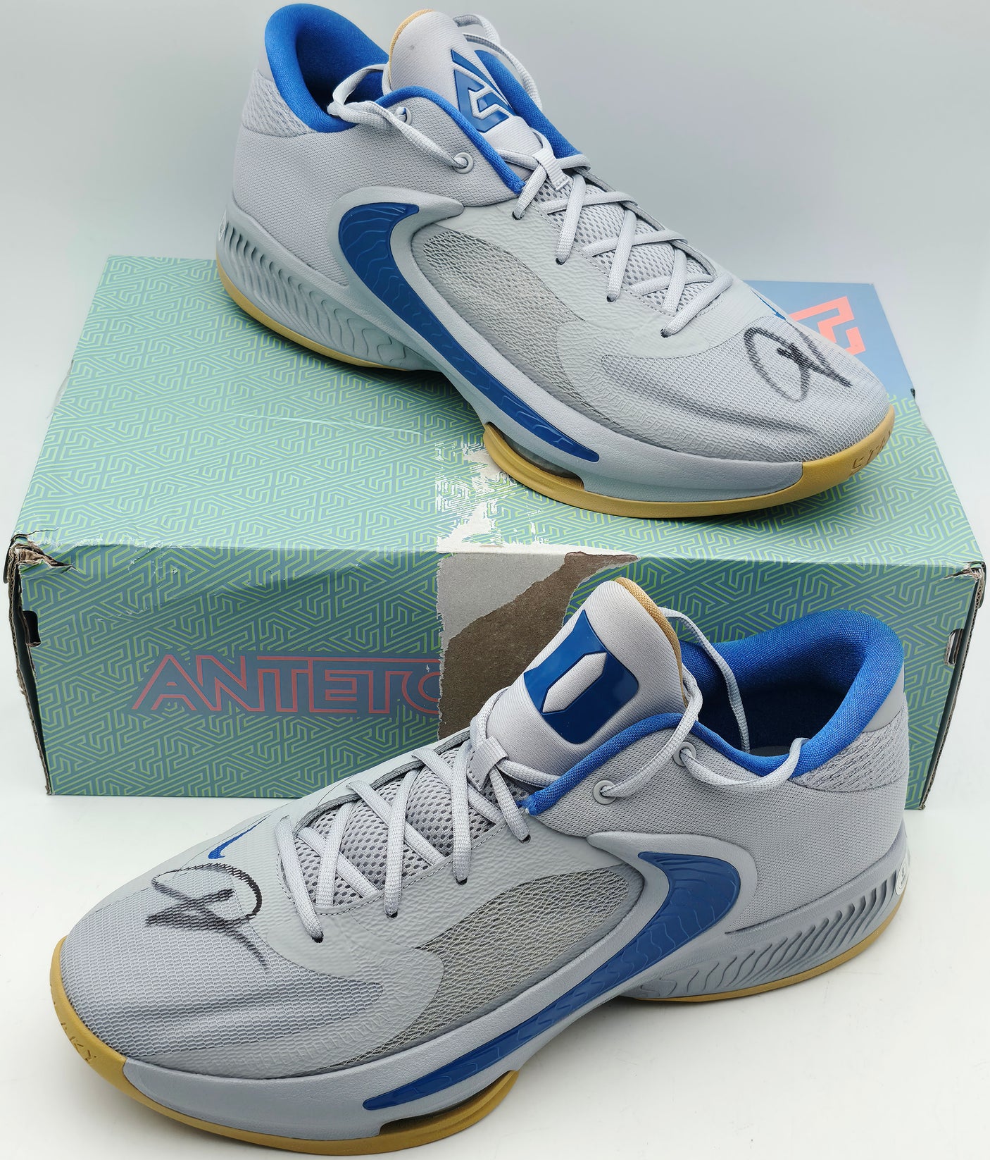 Giannis Antetokounmpo Autographed 2022 Player Exclusive (PE) Promo DUKE BLUE DEVILS Wolf Nike Zoom Freak 4 NCAA SOS Shoes Size 16 (With Box) Beckett BAS Witness #3W399782 & #3W399783