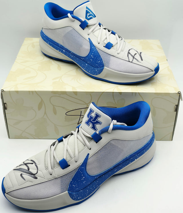 Own a rare piece of NCAA and NBA history with this pair of 2023 Player Exclusive (PE) Promo UNIVERSITY OF KENTUCKY NIGHT SILVER/GAME Nike Zoom Freak 5 NCAA 2 Shoes, hand-signed by NBA superstar Giannis Antetokounmpo. These exclusive sneakers are designed for top-tier athletes and are rarely made available to the public, making them a must-have for serious collectors and fans of Kentucky basketball or Giannis' early NBA legacy.