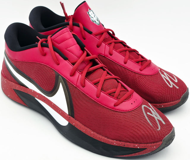 Giannis Antetokounmpo Autographed 2024 Player Exclusive (PE) Promo UNIVERSITY OF ARKANSAS Team Crmsn, White & Black Nike Zoom Freak 6 NCAA P Shoes Size 17 (No Box) Beckett BAS Witness #3W396389 & #3W396390