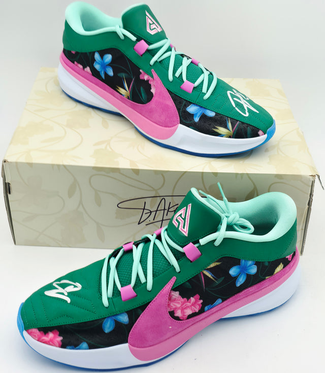 Own a rare piece of NBA history with this exclusive pair of 2023 Player Exclusive (PE) Promo LT PHT BL/BLK-PLYFL Nike Zoom Freak 5 Shoes, personally hand-signed by Giannis Antetokounmpo, two-time NBA MVP and 2021 NBA Champion. These size 17 shoes are the same size worn by Giannis himself, making them a true collector's item for fans of the Milwaukee Bucks superstar. Whether you're a die-hard collector or a lifelong basketball enthusiast, this autographed pair connects you directly to one of the most dominant players of his generation. Authenticated by Beckett Authentication Services (BAS), each pair includes a tamper-proof witness hologram for verified legitimacy. This is a stock item, so signature and shoe condition will be of equal quality to the one shown. Please note that the original box may show minor signs of wear.