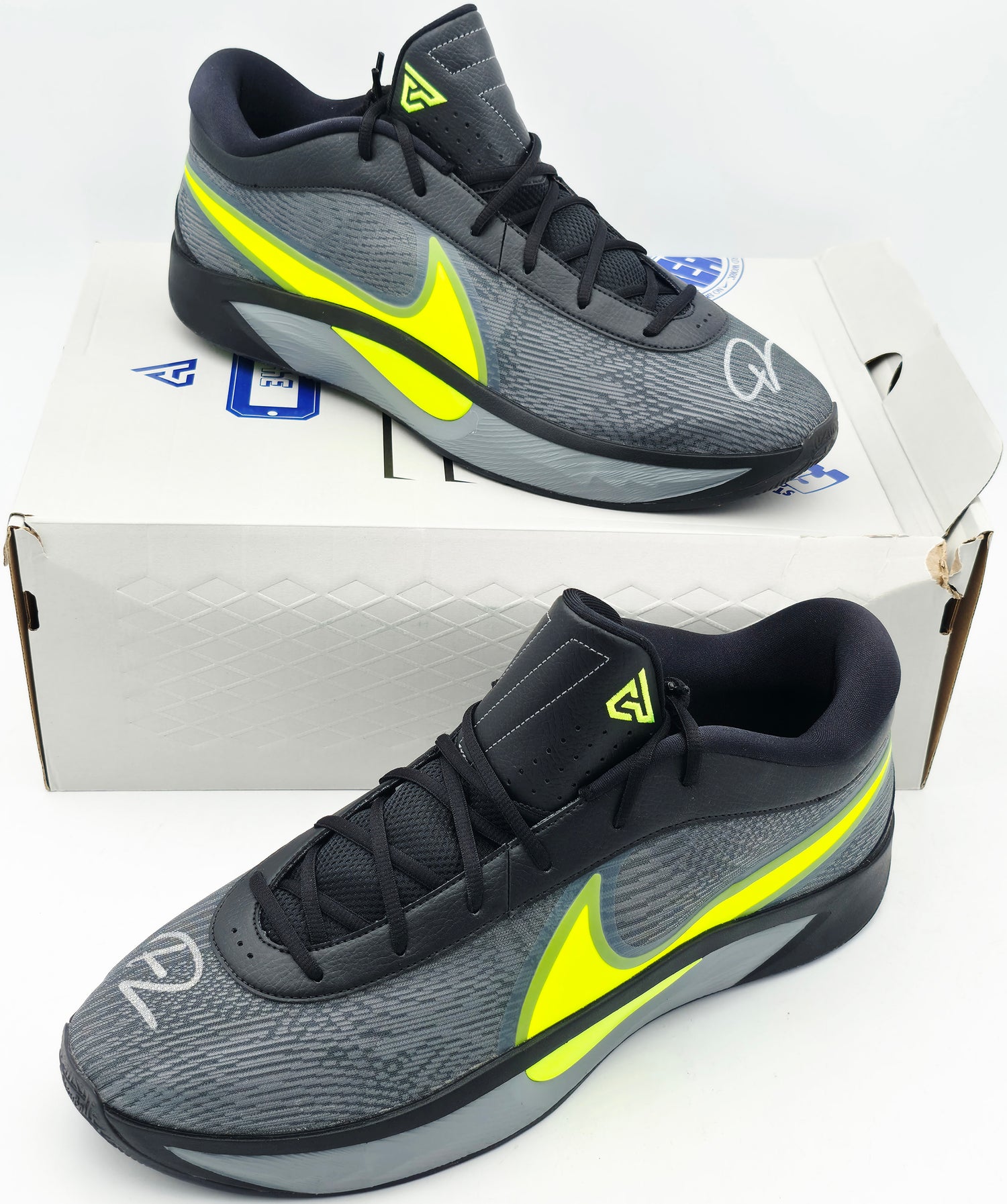 Giannis Antetokounmpo Autographed 2024 Player Exclusive (PE) Promo Black, Volt & Cool Grey Nike Zoom Freak 6 Shoes Milwaukee Bucks Size 17 Beckett BAS Witness Stock #252733