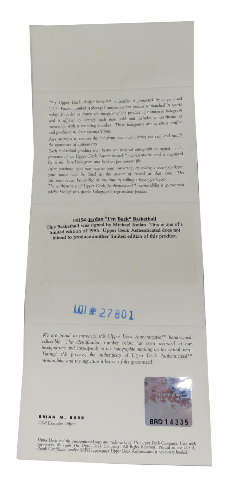 - Authentic Michael Jordan autograph on a high-quality Wilson Jet basketball.