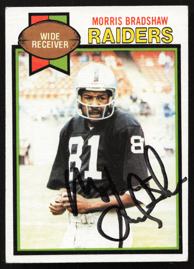 Collector Grade autographed and signed memorabilia: 1979 Topps #28 Morris Bradshaw (Oakland Raiders) trading card—hand-signed and backed by a pass guarantee with Beckett, PSA/DNA, or JSA. Bradshaw was a Raiders wide receiver from 1974–1981 and a two-time Super Bowl champion with the franchise (XI and XV). An Ohio State alum, he contributed as a reliable target and special-teams piece during the team’s championship era.