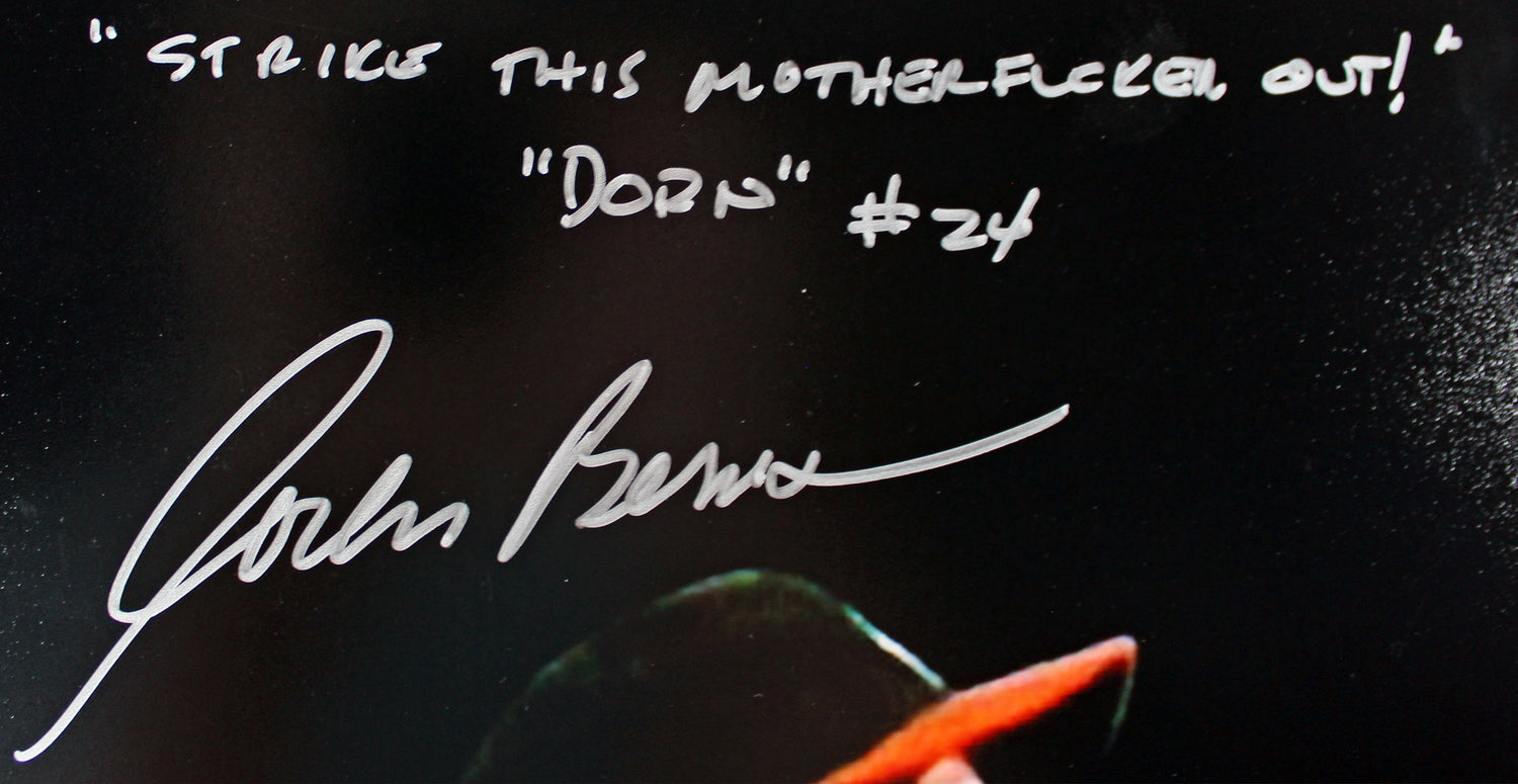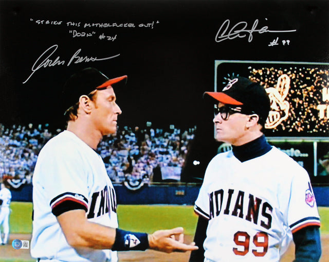Own a piece of cinematic and baseball history with this Autographed 16x20 Photo from the beloved sports comedy Major League. Personally signed by Charlie Sheen (#99) and Corbin Bernsen (#24), this photo captures the iconic rivalry between Ricky "Wild Thing" Vaughn and Roger Dorn, complete with the memorable inscription: "Strike This Motherf* Out Dorn". This collectible is a must-have for fans of the 1989 classic and sports memorabilia enthusiasts alike.