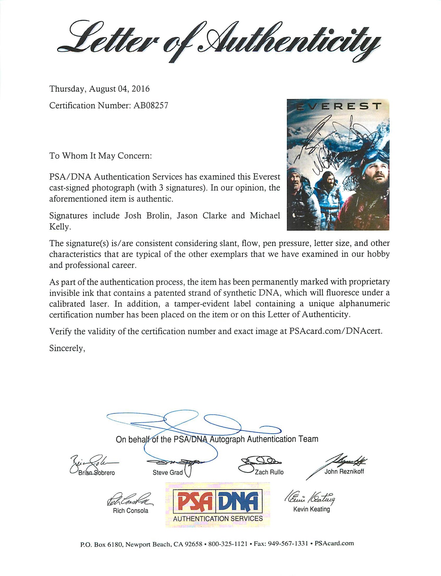 Everest (Josh Brolin, Jason Clarke Michael Kelly) Signed 11X14 Photo PSA AB08257 is backordered and will ship as soon as it is back in stock.
