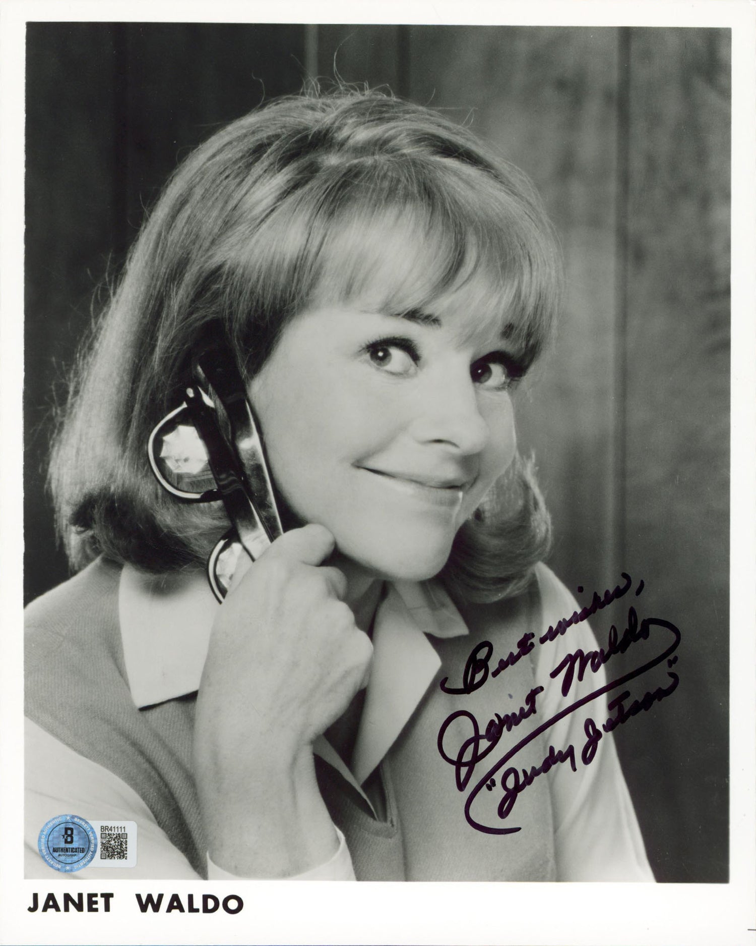 Own a piece of animated television history with this Janet Waldo Autographed 8x10 Photo, featuring her iconic inscription, "Best Wishes Judy Jetson." Known for voicing the beloved character Judy Jetson in the classic series The Jetsons, Waldo was a leading voice actress during the golden age of animation. This personally signed photo is a must-have collectible for fans of vintage cartoons and pop culture memorabilia enthusiasts alike.