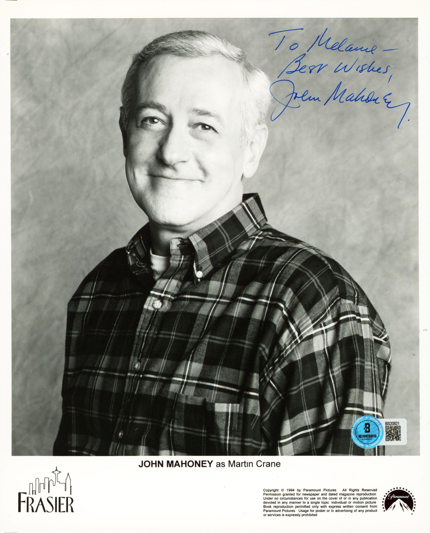 - Genuine autograph of John Mahoney, who starred as Martin Crane in the Emmy Award-winning series Frasier