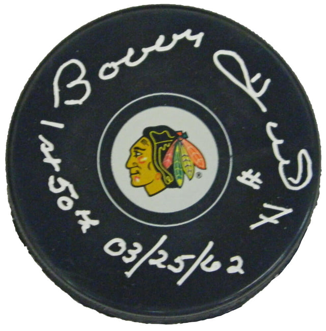 Bobby Hull Signed Chicago Blackhawks Logo Hockey Puck w/1st 50th 03-25-62